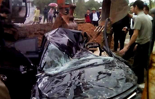 Tại hiện trường, ôtô 5 chỗ bị phần thùng sau của xe container đè lên khiến thân xe bẹp dúm. Lực lượng chức năng đã phải huy động máy xúc để đào đất xung quanh ôtô gặp nạn, đưa các nạn nhân ra ngoài.