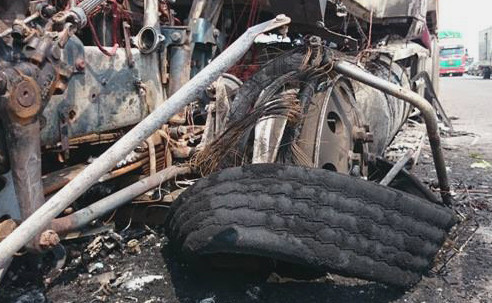 Chiếc xe trên kéo theo rơ móc mang BKS 15R - 002.79, đang lưu thông trên cầu Thanh Trì, bất ngờ cháy ngùn ngụt ở phần đầu xe. Chỉ một lúc sau, ngọn lửa thiêu rụi toàn bộ phần đầu xe.
