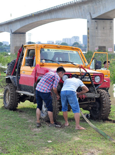Một chiếc bán tải khác phải lùi lại làm điểm neo để Ranger mắc tời vào và thoát vũng bùn.