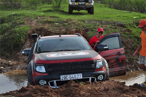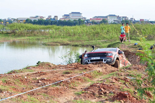 Một chiếc Ford Ranger khác đang thử sức với một đoạn hố sâu. Do chiều dài cơ sở lớn, góc tới cũng như góc thoát đều hẹp nên xe đã không thể vượt qua.