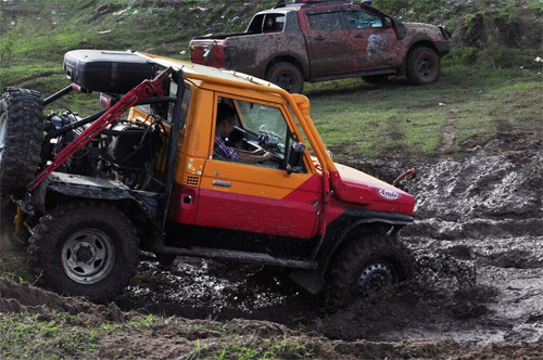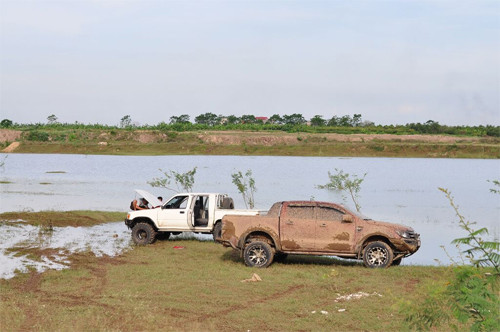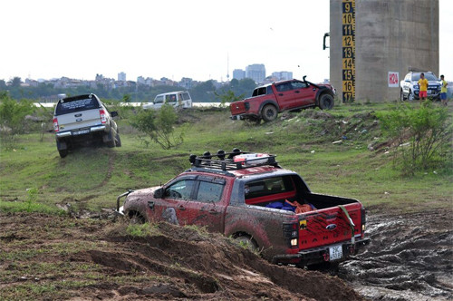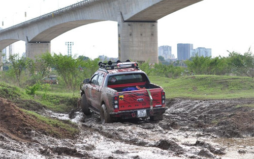Ford Ranger độ đầy đủ lốp đi bùn, bộ thụt ARB nhưng vẫn khá khó khăn để vượt qua vũng bùn tạo nên bởi cơn mưa trước đó.