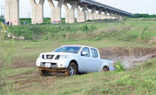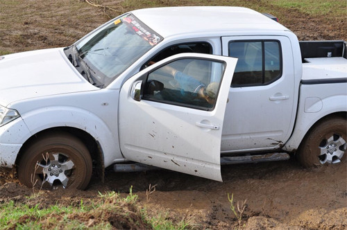 Một chiếc Nissan Navara hoàn toàn nguyên bản đang cố thoát khỏi vũng bùn.