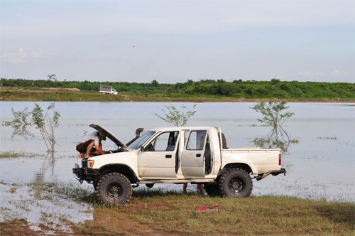 Toyota Hilux máy dầu đã trang bị nâng gầm, lốp đặc chủng, ống thở nhưng không qua nổi hố nước sâu, được tời lên và đang mở nắp để chỉnh giàn kim phun.