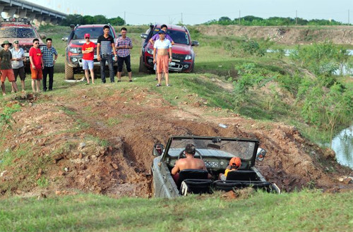 Là một chiếc xe 2 cầu nhưng độ bám của bộ lốp HT không cho phép chiếc xe nặng gần 2 tấn thoát khỏi vùng bùn nhỏ.
