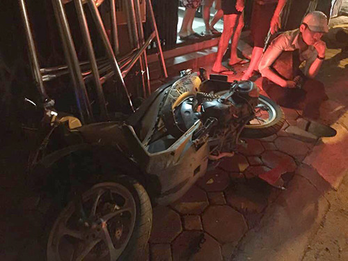 Tại hiện trường, xe ôtô bị hư hỏng nhẹ phần đầu, phía gầm trước đè lên một xe máy, một xe máy khác văng lên vỉa hè, một xe vỡ tan phần đầu nằm dưới lòng đường.