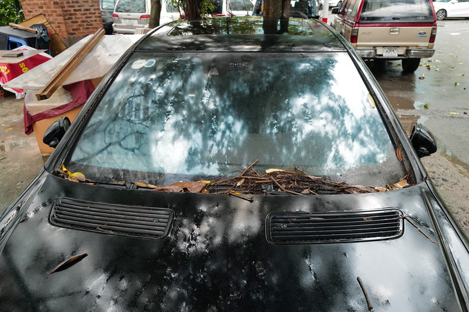 Cặp gương còn nguyên vẹn, cành lá rụng rơi đầy ở kính lái. Cơn mưa lớn thổi sạch lớp bụi bám trên kính chắn gió.