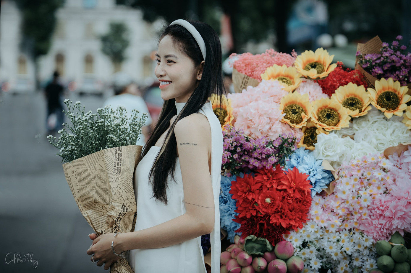 Ngọc Thảo (sinh năm 2002, TP.HCM) dành thời gian để tới chụp ảnh cùng xe hoa mùa thu ở Công viên Gia Định. Thảo chọn trang phục áo dài trắng truyền thống, dịu dàng thả dáng bên xe hoa.