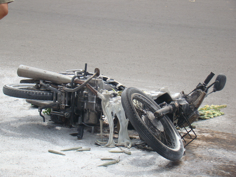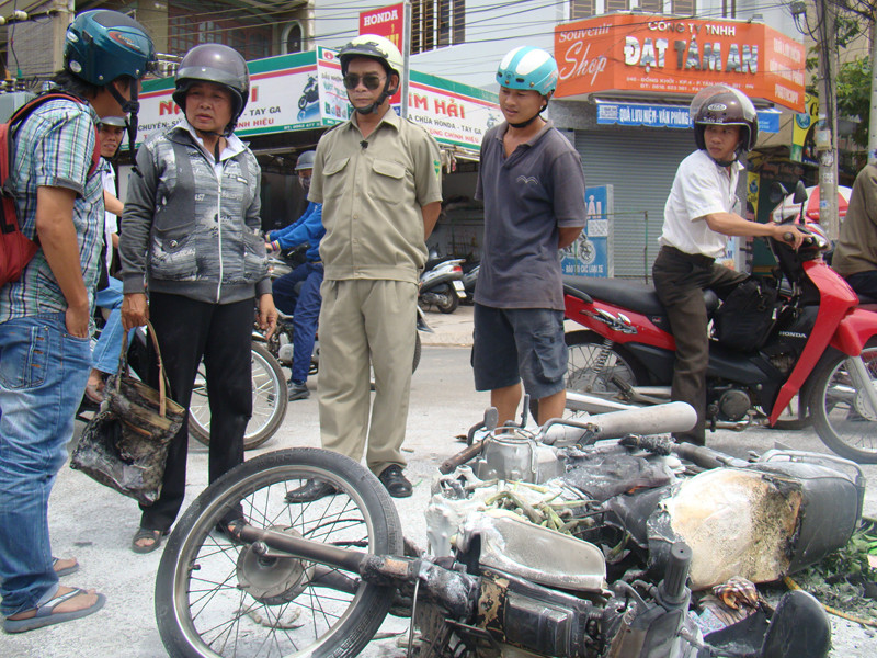 Người điều khiển chiếc xe máy không hề hay biết, đến khi người đi đường phát hiện báo cho bà Nụ chạy thì cũng là lúc lửa đã bốc cháy ngùn ngụt. Một chiếc xe bus chạy qua đã dùng bình chữa cháy dập lửa. Tuy nhiên chiếc xe đã cháy phần nhựa, một bao quần áo chở trên xe máy cũng cháy rụi cùng tài sản của chủ xe. Bà Nụ cho biết mới khởi động xe chạy từ nhà ra được khoảng 2km thì xảy ra vụ việc.