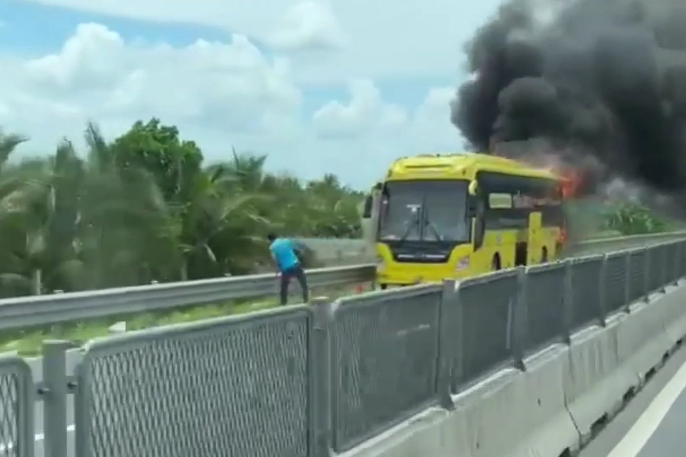 Tài xế dừng phương tiện trên đường kiểm tra thấy lửa bốc lên, bùng phát mạnh. Nhiều hành khách trên xe hốt hoảng bỏ chạy ra ngoài.