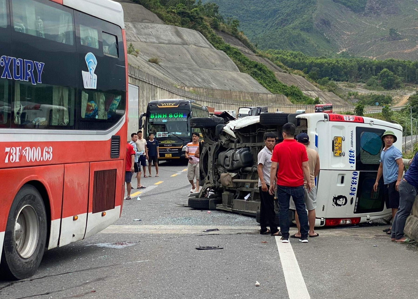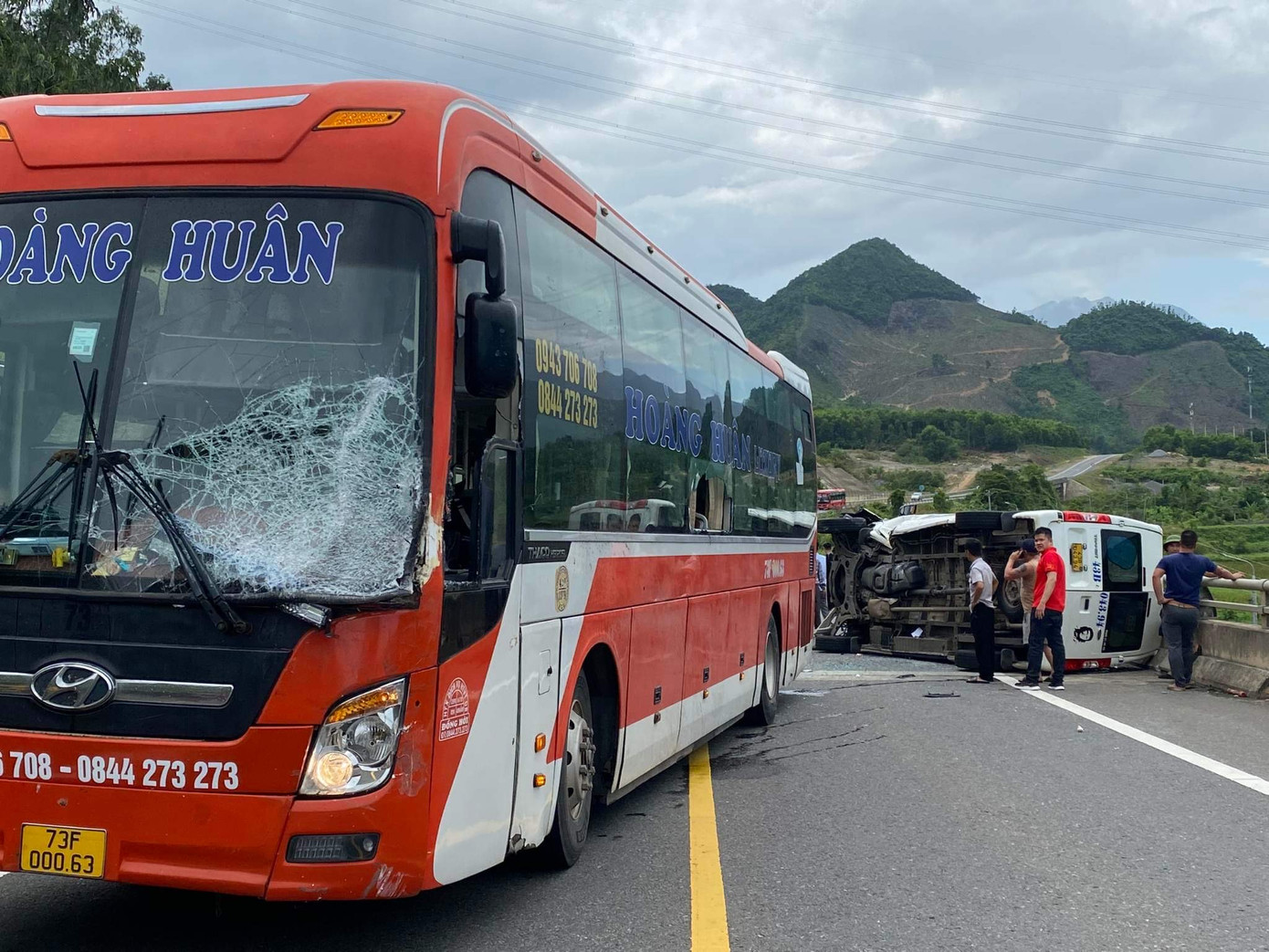Thời điểm trên, xe ô tô khách BKS 73F-000.63 chạy hướng Bắc - Nam và xe 16 chỗ ngồi BKS 43B-043.94 chạy hướng ngược lại. Khi đến Km 61+456, bất ngờ ô tô khách đâm trực diện xe 16 chỗ ngồi khiến xe này lật ngang đường, biến dạng phần đầu.