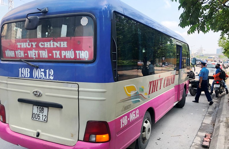 Tại khu vực gần dốc cầu lên cầu vượt Mai Dịch, tổ công tác tuần tra cắm chốt ở đây đã đón lõng và dừng được xe khách 19B-005.12 của nhà xe Thủy Chính để xử lý.