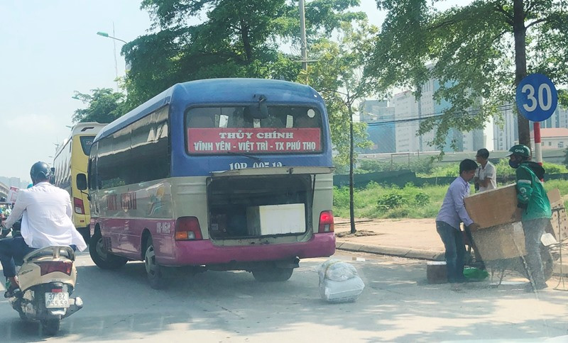 Trong ảnh, xe có BKS 19B-005.12 của nhà xe Thủy Chính chạy tuyến Phú Thọ dừng đỗ, nhận hàng trên đường Phạm Hùng sáng 18/5 được tổ công tác tiếp cận, ghi lại hỉnh ảnh, sau đó báo cho tổ công tác chốt trực trên đường.