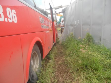 Tại hiện trường, đầu chiếc xe khách đâm sập một đoạn rào chắn công trình bằng tôn, đuôi xe vẫn nằm ngoài lòng đường. Rất may không có thương vong trong vụ tai nạn này.