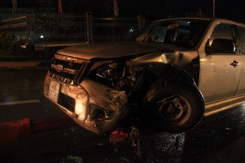 Tại hiện trường, chiếc xe ô tô của chị Nhung bị móp và hư hỏng phần đầu xe, bánh xe bị nghiêng ra bên ngoài; còn chiếc xe Lexus cũng bị hư hỏng nặng và nằm vắt ngang dải phân cách trên đường.