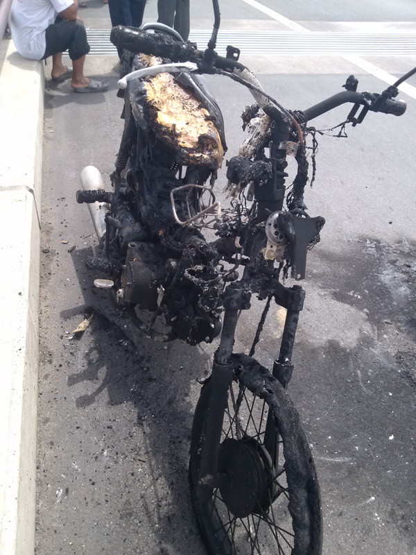 Tại hiện trường, chiếc xe máy chỉ còn trơ khung. Bánh trước, phần máy và yên xe cháy đen.