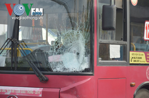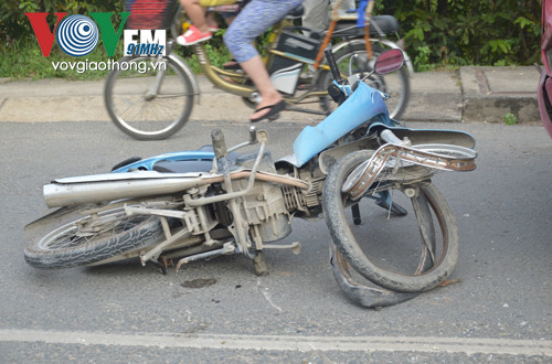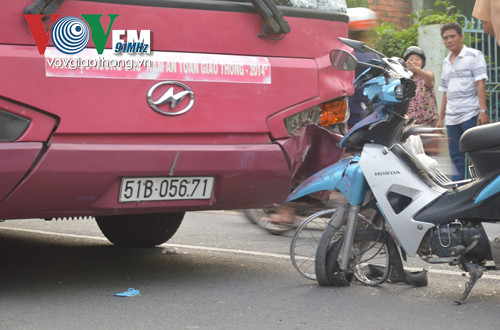 Tại hiện trường, đầu xe buýt bị hư hỏng phía đèn xe bên trái, kính xe bị rạn nứt, xe máy bị hư hỏng nặng đầu xe nát bét.
