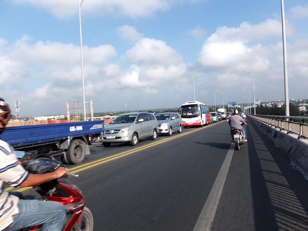 Xe cộ bị ùn ứ nhiều km do tai nạn xảy ra trên cầu.
