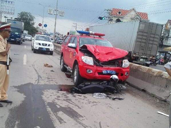Vào thời điểm trên chiếc xe ô tô loại bán tải của Phòng Cảnh sát PCCC huyện Nhơn Trạch (Đồng Nai) BKS- 00285 lưu thông theo hướng từ TP Biên Hòa- Nhơn Trạch khi qua giao lộ ngã ba Phước Tân đã tông trực diện vào chiếc xe máy do hai thanh niên điều khiển đang băng qua giao lộ. Sau va chạm, xe ô tô cuốn xe máy đẩy xa hàng chục mét.