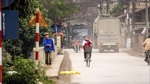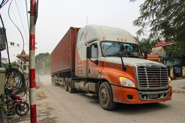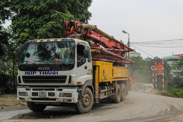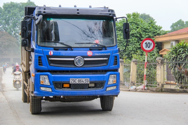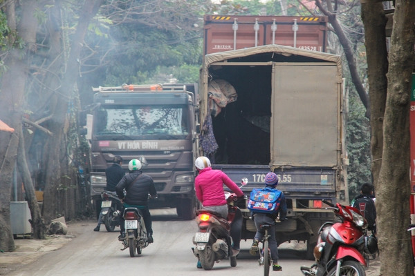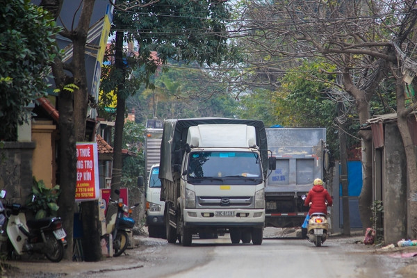Ngay từ sáng sớm, những chiếc xe chở đất, vật liệu, xe tải hạng nặng đã lưu thông trên tuyến đường này. Mật độ xe trọng tải lớn nối đuôi nhau qua tuyến đường này liên tục, “Cứ tầm 10 phút lại có xe trọng tải lớn đi vào đây, mặc dù ở đây chỉ cắm biển cho xe 10 tấn nhưng thực tế rất nhiều xe có trọng tải hàng chục tấn, xe container ra vào liên tục”, bác Phúc một cư dân ở đây bức xúc.