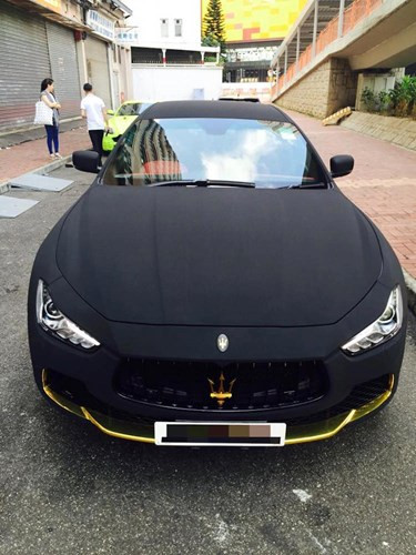 Biểu tượng đinh ba của Maserati trên lưới tản nhiệt, cùng với hốc gió trên cản trước được bọc trong giấy dán màu vàng chrome "chói lọi".