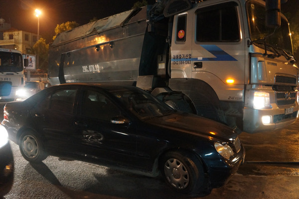 Khi đến khu vực siêu thị Pico, xe tải rẽ, va chạm với chiếc Mercedes. Vụ va chạm khiến Mercedes bị móp đầu, gây ách tắc giao thông ở khu vực này.