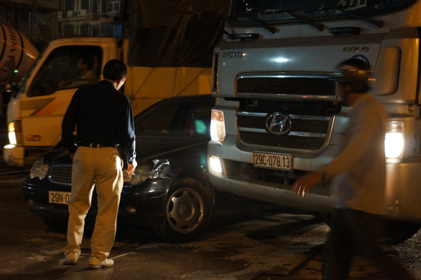 TPO – Khoảng 21h ngày 15 – 11, xe tải mang BKS 29C – 078.13 chèn vào đầu chiếc Mercedes, BKS 29N – 0333, khiến xe này bị móp đầu.