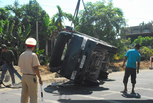 Sáng nay, xe tải mang biển số kiểm soát 75C - 00832 của doanh nghiệp tư nhân Phúc Hảo trú tại 43 An Dương Vương, TP Huế chở hàng chục bình gas từ Tp.Huế đi theo hướng Nam - Bắc, đến địa điểm trên thì lật nhào.