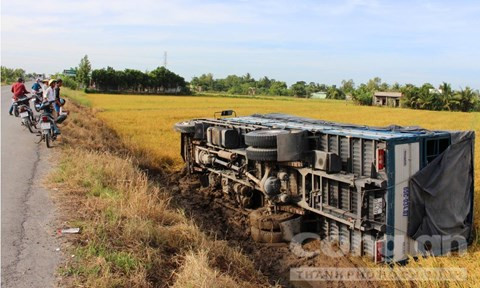 Chiếc xe tải chở vỏ nước ngọt khi đi qua khu vực phường Thới An Đông, quận Bình Thủy (Cần Thơ) thì lao xuống ruộng do tài xế ngủ gật. Rất may không có thiệt hại về người.