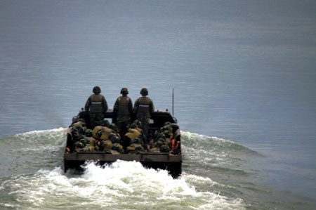Cán bộ, chiến sĩ Lữ đoàn Công binh 299 điều khiển phà tự hành.