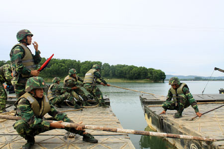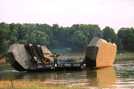 Cán bộ, chiến sĩ Lữ đoàn 299 thực hành ghép cầu bảo đảm cho các phương tiện vượt sông, vượt ngầm.