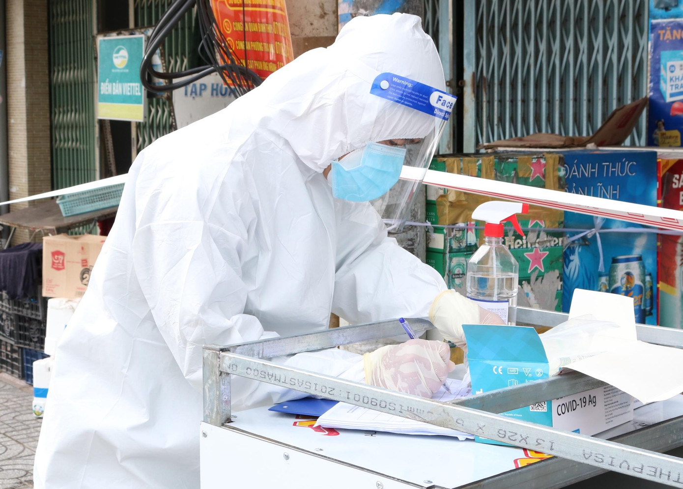 | Nhân viên y tế phường Trà Nóc, quận Bình Thuỷ ghi thông tin người được lấy mẫu - Ảnh: Kim Hà. |