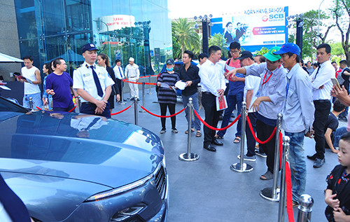Sáng nay, tại Trung tâm Thương mại Vincom Plaza Xuân Khánh có hàng trăm người đến tham quan, tìm hiểu các mẫu xe VinFast trưng bày, gồm hai mẫu ô tô VinFast Lux SA 2.0, VinFast Lux A 2.0; 3 chiếc xe ô tô cỡ nhỏ Fadil và xe máy điện Klara.