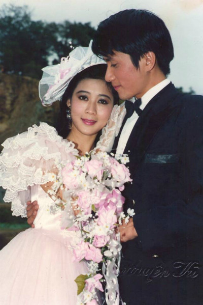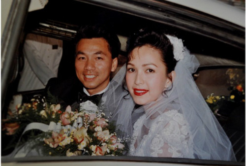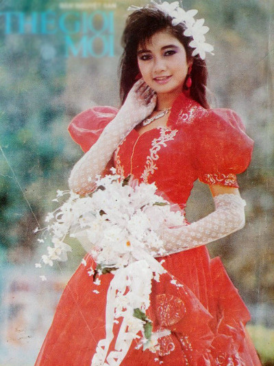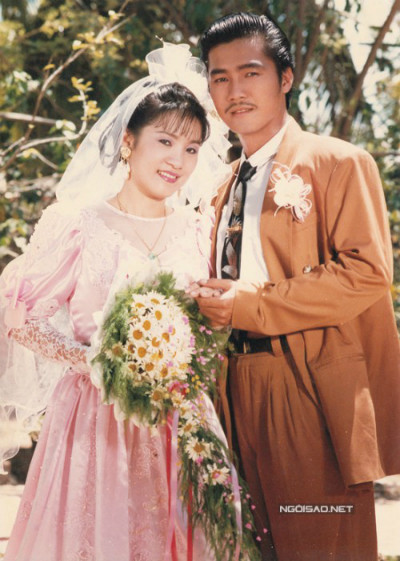 Diễm My diện váy cưới màu trắng, tô son đỏ rực trong đám cưới với doanh nhân Việt kiều năm 1994.