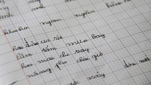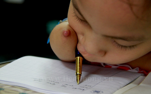 Đến giờ học bài, Chi ngồi vào bàn. Chiếc bút máy được kẹp chặt vào một bên tay và miệng. Mỗi nét chữ đưa đi, tay và miệng Chi lại di chuyển theo. “Khi đi em hỏi, khi về em chào…”, Chi đánh vần, rồi kẹp lại chiếc bút vào miệng, viết từng chữ trên cuốn vở ly. Nhiều khi viết xong chữ, tay Chi tấy lên vì đau.