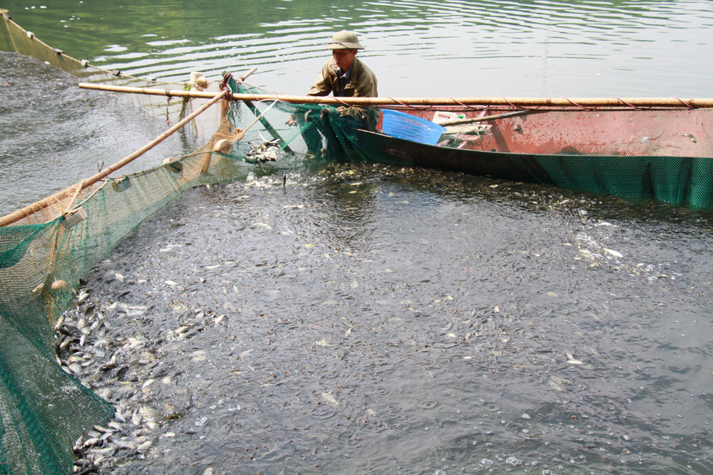 | Rất nhiều cá được dồn vào trong các tấm lưới. Nhiều công nhân cho biết, có cả những con cá nặng tới chục kg. Ảnh: Trường Phong. |