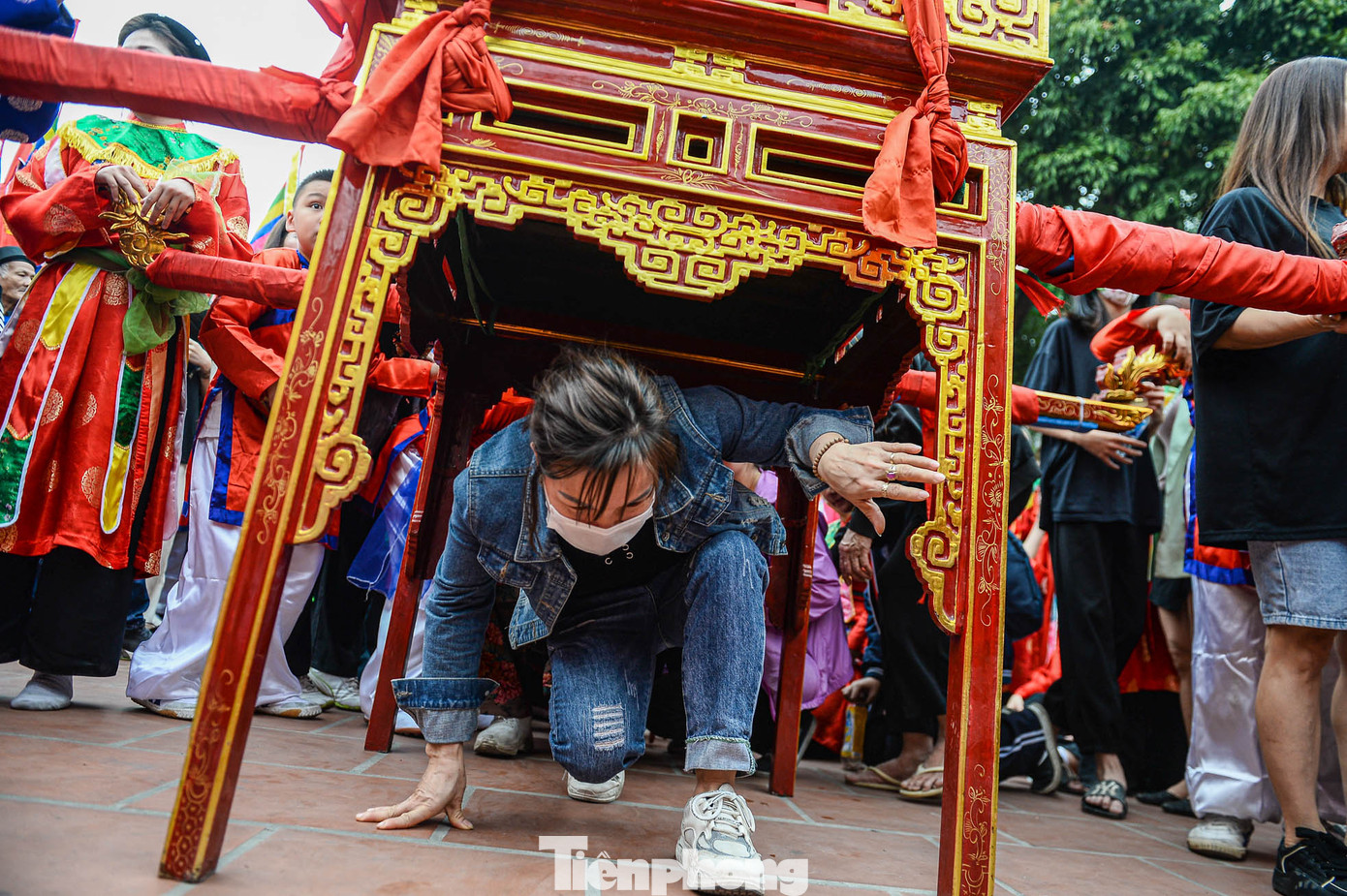 | Nhiều người dân, du khách tranh thủ chui qua các kiệu để cầu may. |