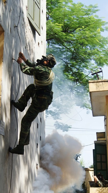 Chúng tôi cử 3 phân đội tiến công, trinh sát và tiêu tẩy, thực hiện nhiệm vụ đánh bắt các đối tượng khủng bố, giải thoát con tin; trinh sát, phát hiện các loại hóa chất độc hại tại khu vực xảy ra tình huống; tiêu tẩy, xóa dấu vết và làm sạch môi trường”, thượng úy Quyết nói.
