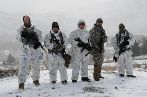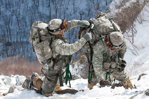 Một tổ chiến đấu lên được đỉnh núi phủ đầy tuyết.