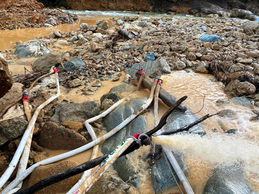 Huy động nhiều phương tiện, nhân lực, thiết bị hút nước lòng sông Rào Trăng.
