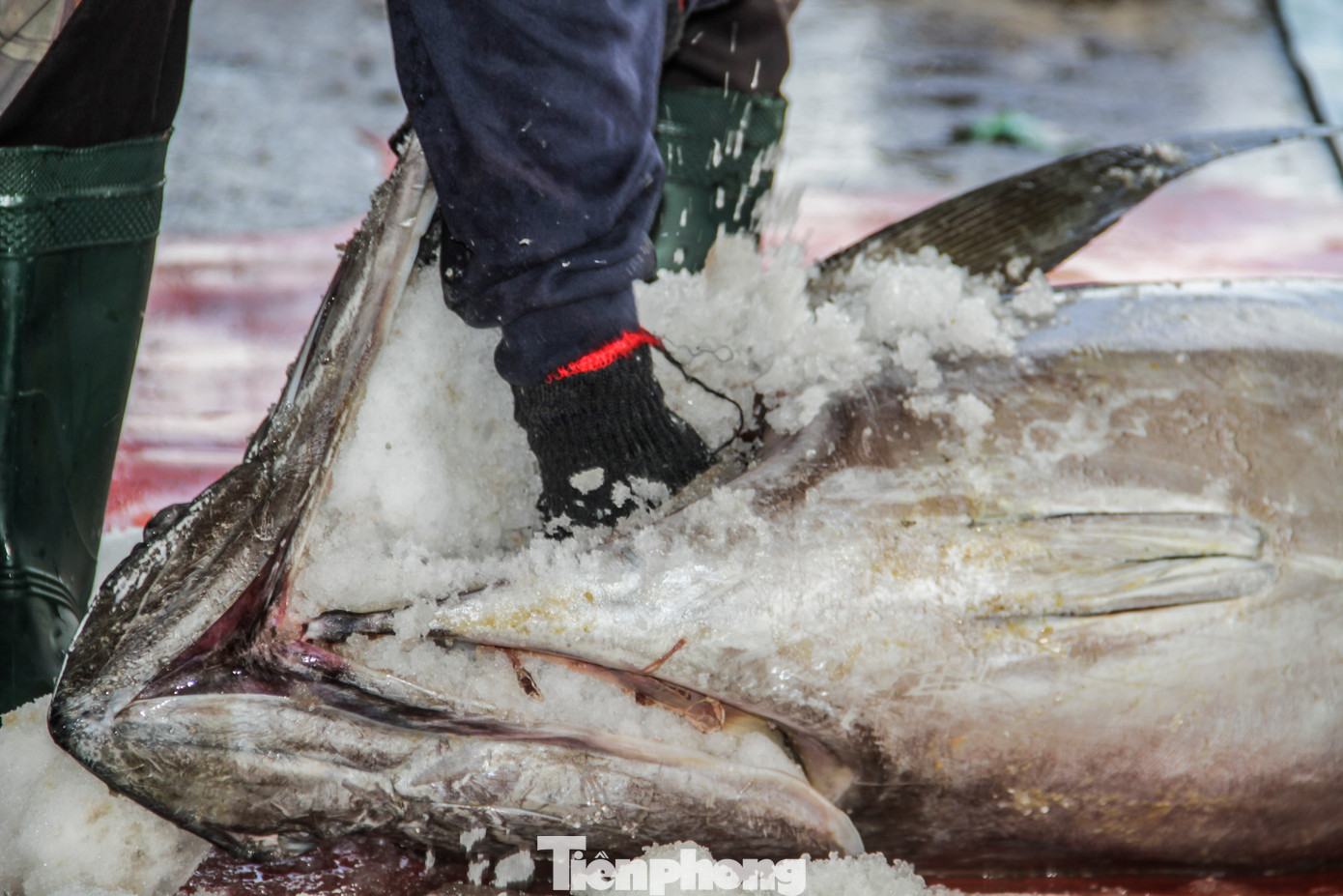 | Thương lái kiểm tra chất lượng thịt cá ngừ đại dương trước khi cho lên xe. Ảnh: Trương Định |