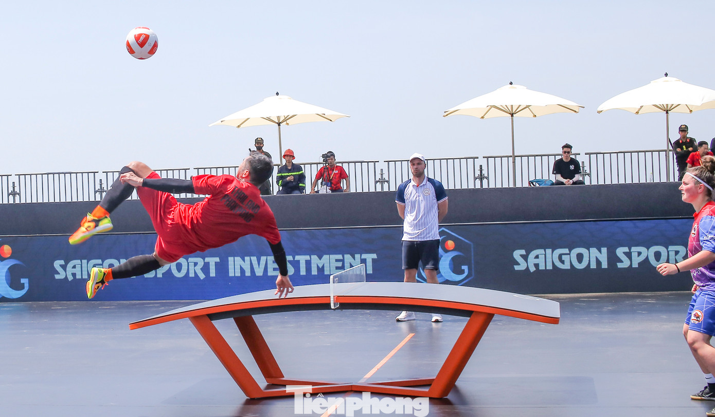 | Teqball là môn thể thao kết hợp các yếu tố của bóng đá, bóng bàn. Điểm đặc biệt là bóng được chơi trên bàn cong. Ảnh: Trương Định |
