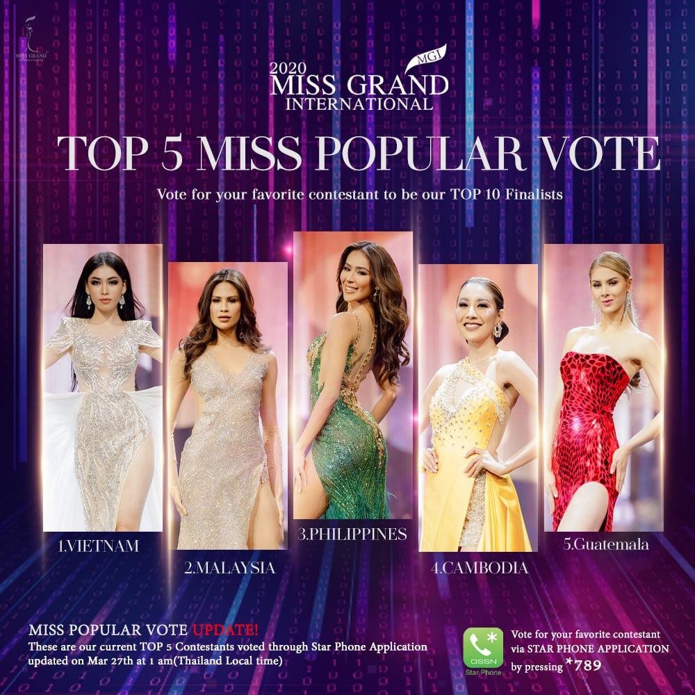 Hiện tại, Ngọc Thảo dẫn đầu bảng xếp hạng của giải thưởng Miss Popular Vote (cập nhập vào lúc 1 giờ sáng ngày 27/3). Nếu tiếp tục trụ vững ở thứ hạng cao nhất trước khi cổng bình chọn khép lại thì Á hậu Ngọc Thảo sẽ có cơ hội dành được tấm vé bước vào top 10 chung cuộc Miss Grand International 2020.