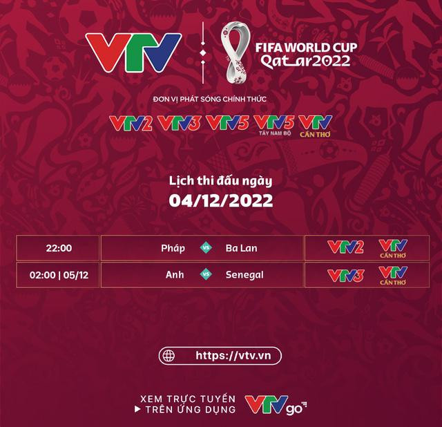 Trận đấu giữa Anh và Senegal diễn ra lúc 02h00 ngày 5/12 được VTV tường thuật trực tiếp trên kênh VTV3 và VTV Cần Thơ cũng như ứng dụng VTVGo. Ngoài ra, khán giả có thể xem trực tuyến các kênh sóng này miễn phí thông qua ứng dụng TV360 của Viettel.
