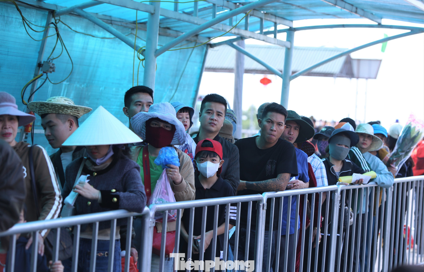 | Ngay từ sáng sớm, hàng dài người dân xếp hàng chờ đến lượt lên thuyền, đi xe điện để di chuyển vào trong chùa. |