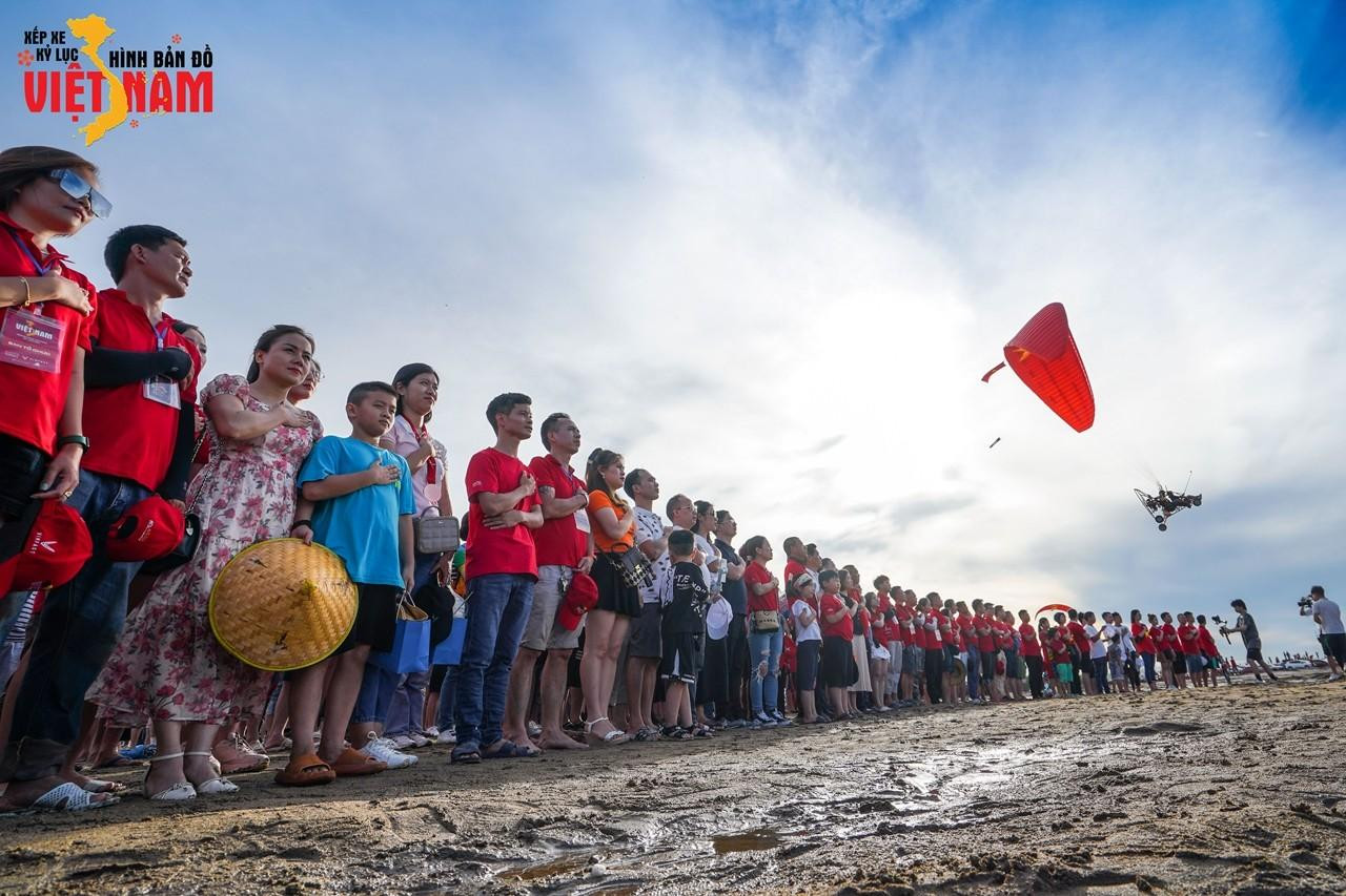 Đúng như lịch trình dự kiến, 15h00 buổi chiều ngày 9/7, sau 18 tiếng ròng rã thực hiện, chiếc bản đồ Việt Nam khổng lồ xếp từ 1.680 chiếc xe trên bãi đất rộng đến 16 ha đã hoàn thành. Khoảnh khắc hàng ngàn thành viên tham gia đến từ mọi miền Tổ quốc đứng nghiêm trang chào cờ, trên đầu là chiếc dù lượn mang lá cờ đỏ sao vàng bay phấp phới chắc chắn sẽ trở thành ký ức khó quên với tất cả những ai có mặt tại Đồi Rồng hôm ấy.