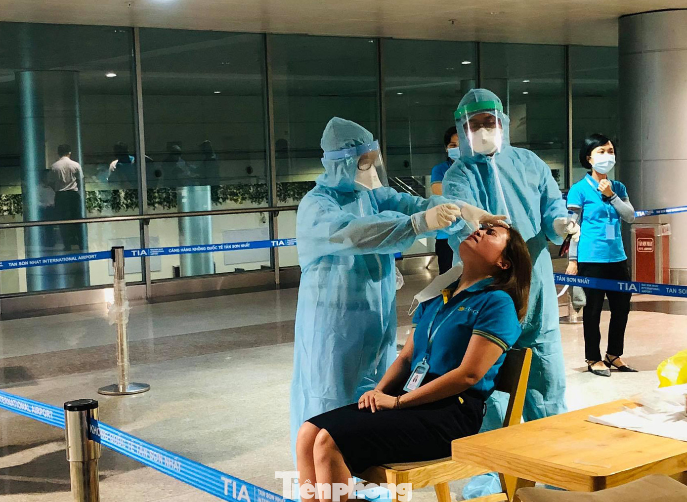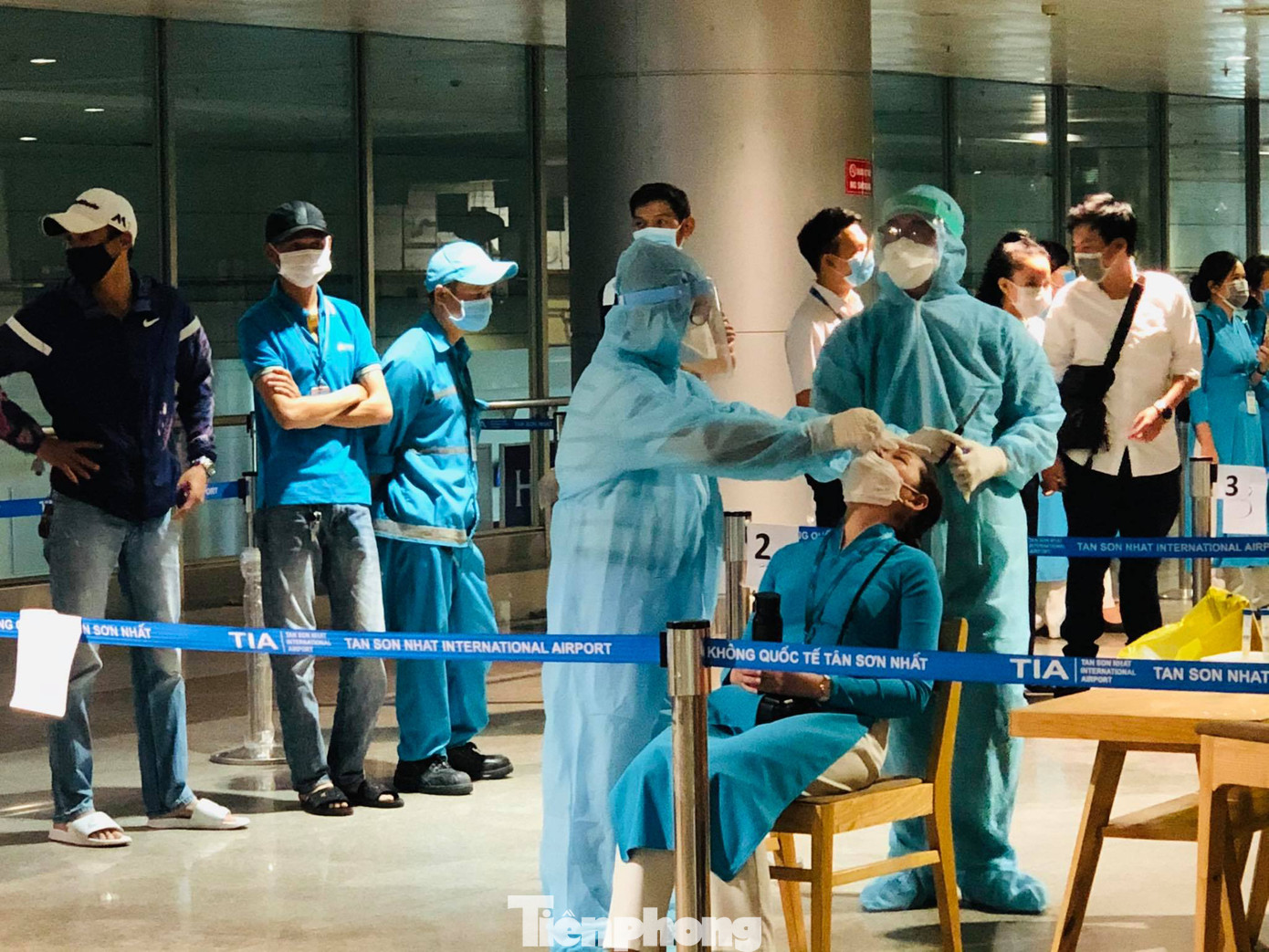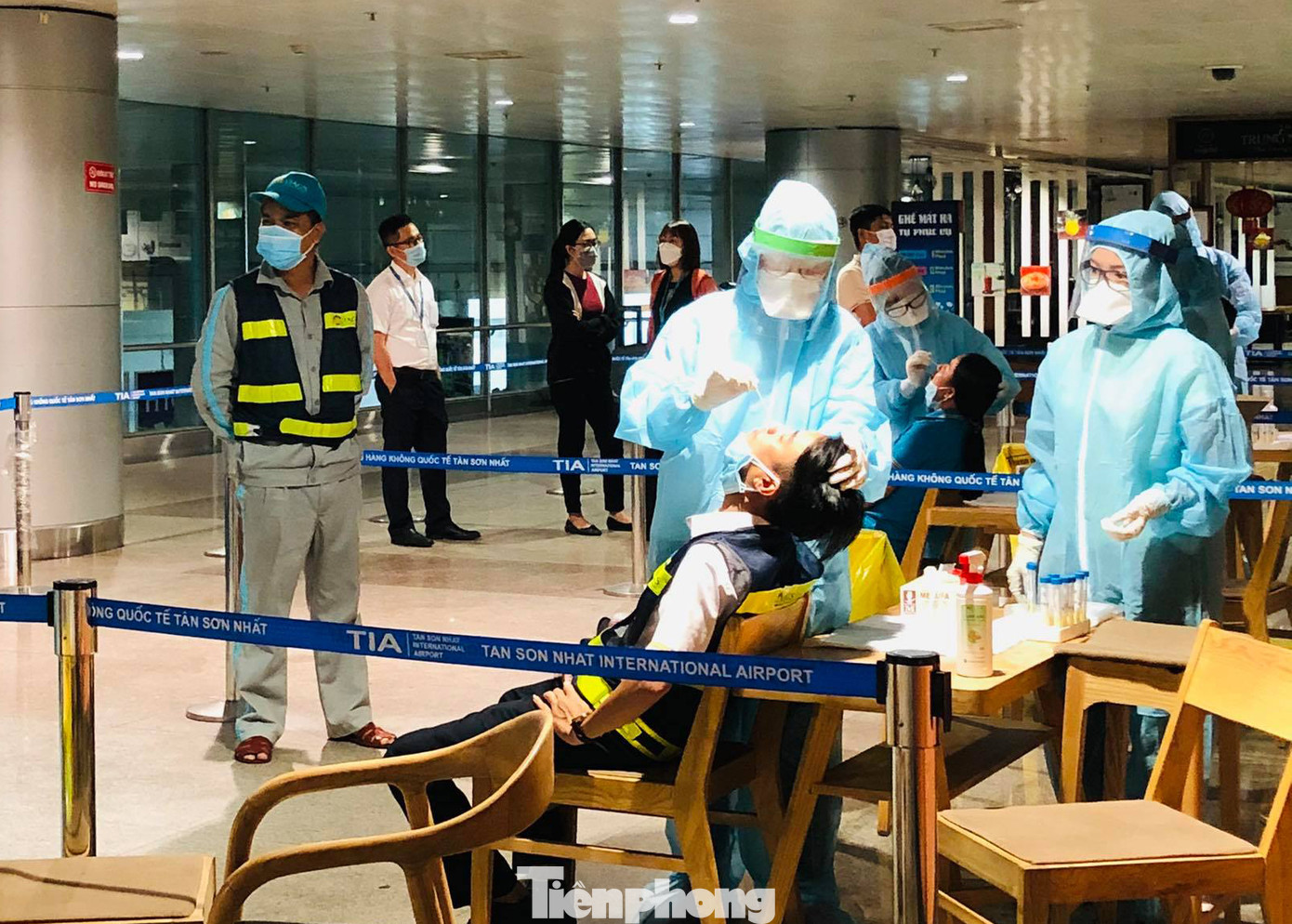Những hình ảnh lấy mẫu xét nghiệm cho các bộ công nhân viên khối cơ quan bộ phận mặt đất được ghi nhận tại sân bay Tân Sơn Nhất trong chiều ngày 17/2.