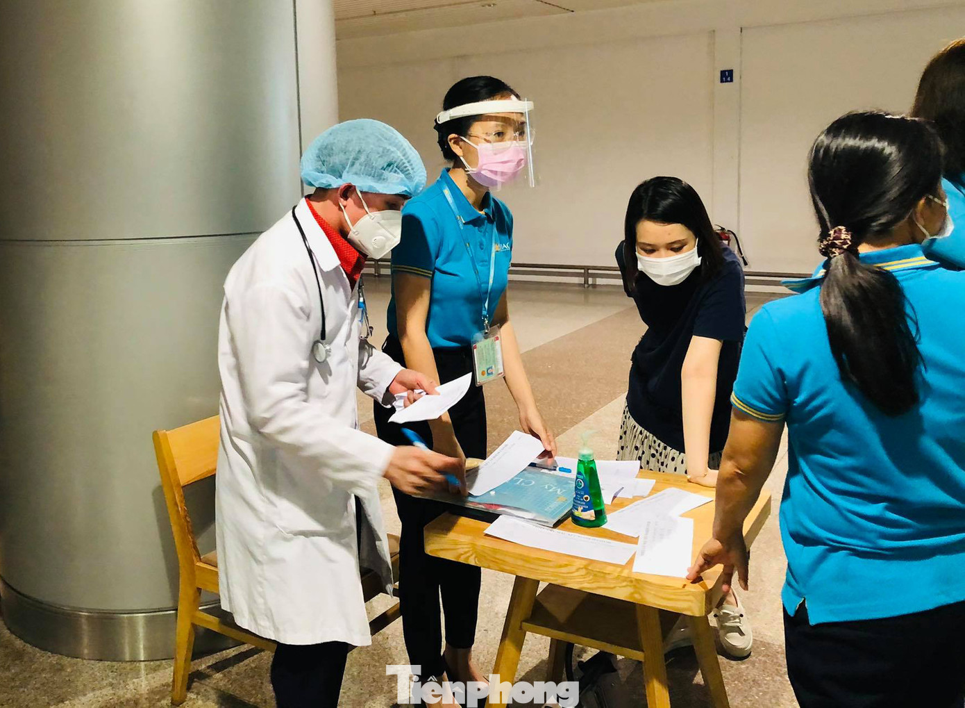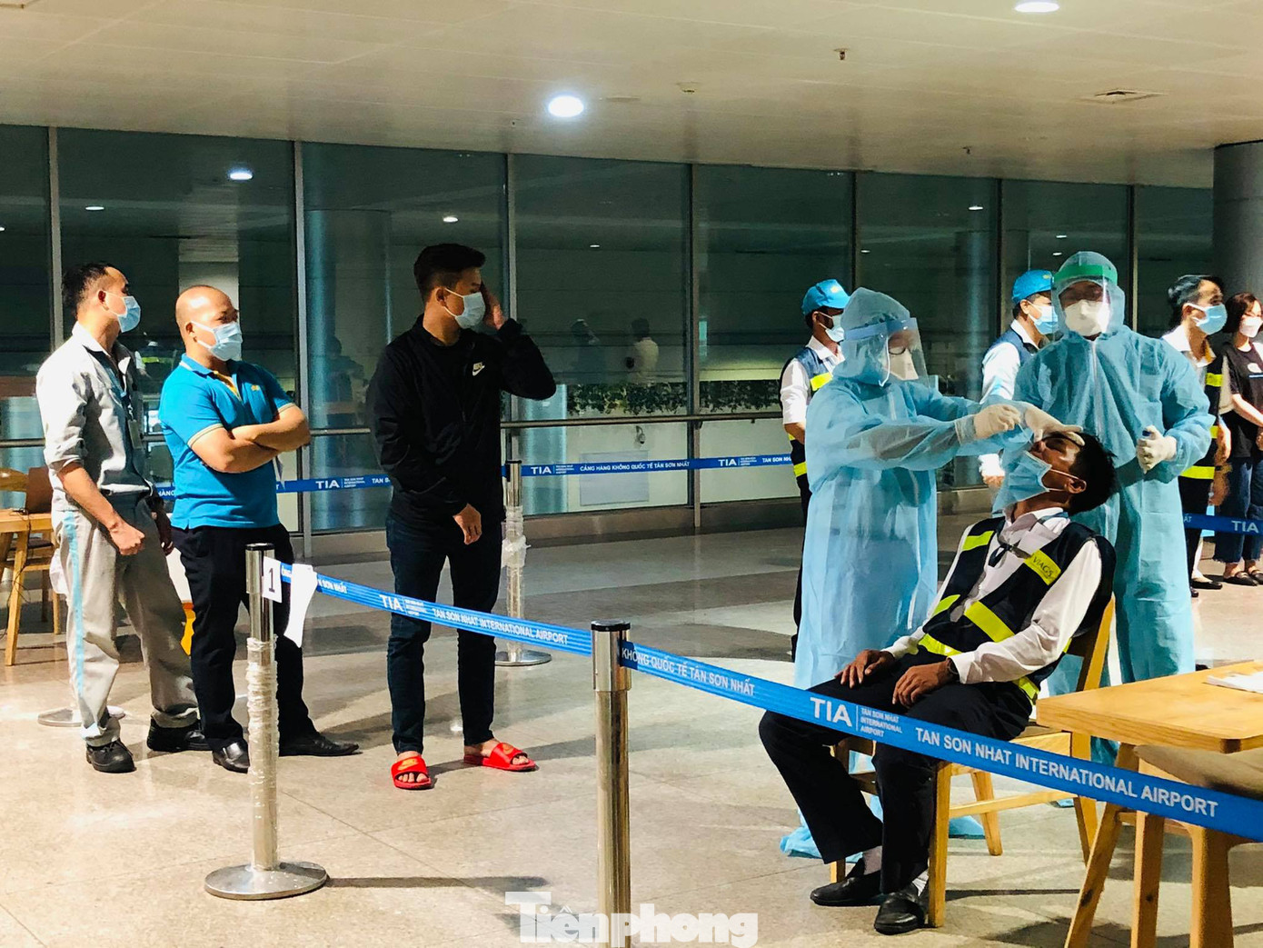 Các cán bộ công nhân viên bộ phận dịch vụ mặt đất sân bay Tân Sơn Nhất xếp hàng khai tờ khai y tế và lấy mẫu xét nghiệm COVID-19 trong chiều nay.