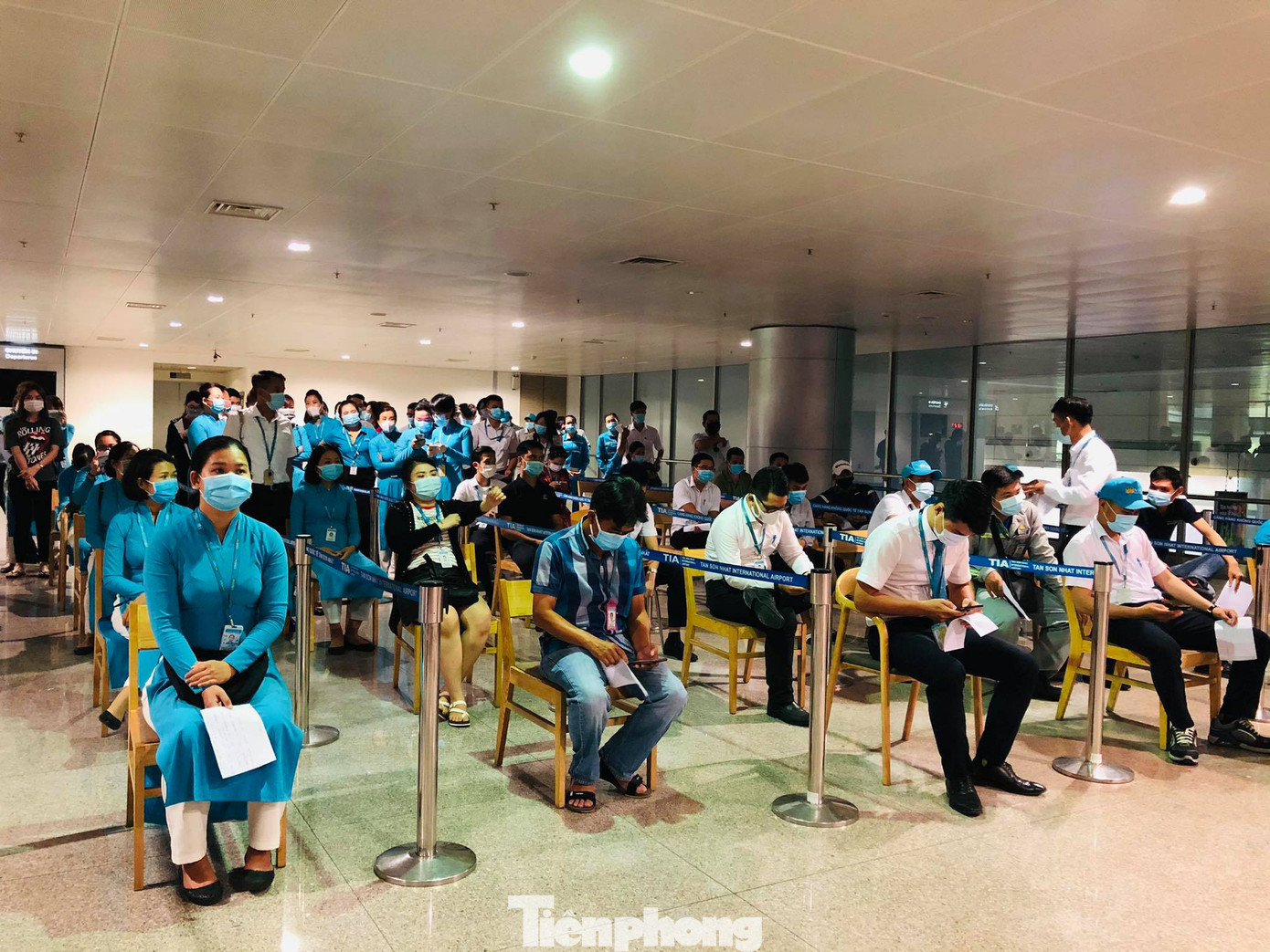 Các cán bộ công nhân viên bộ phận mặt đất xếp hàng giãn cách đợi lấy mẫu xét nghiệm trong chiều nay.