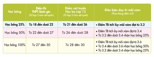 Ngoài ra, khi thí sinh tham gia xét tuyển bằng phương thức học bạ còn có cơ hội nhận học bổng 25%, 50% và 100% học phí không giới hạn số lượng.