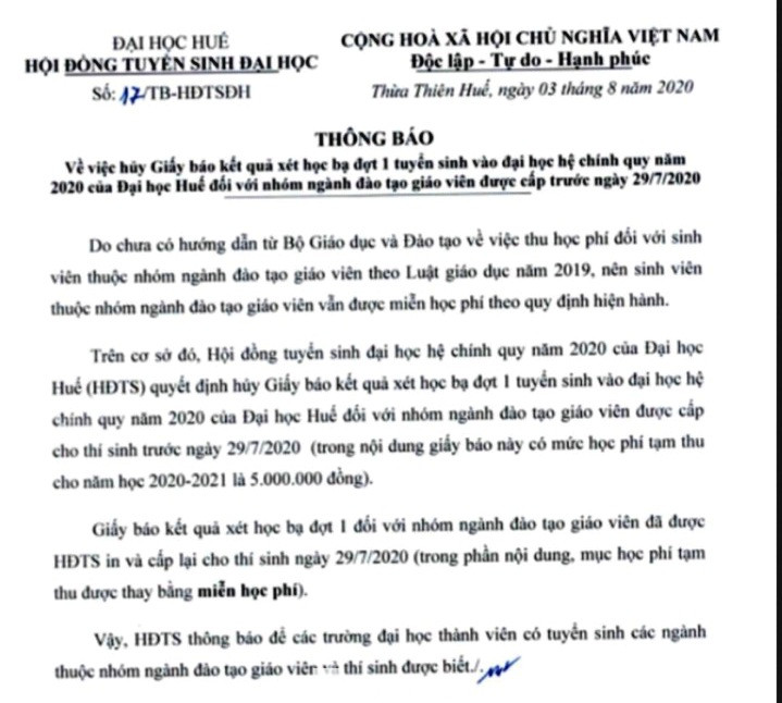 Trên cơ sở đó, HĐTS đại học hệ chính quy năm 2020 của ĐH Huế quyết định hủy Giấy báo kết quả xét học bạ đợt I tuyển sinh vào đại học hệ chính quy năm 2020 của ĐH Huế, đối với nhóm ngành đào tạo giáo viên được cấp cho thí sinh trước ngày 29/7/2020 (trong nội dung giấy báo này có mức học phí tạm thu cho năm học 2020-2021 là 5.000.000 đồng).